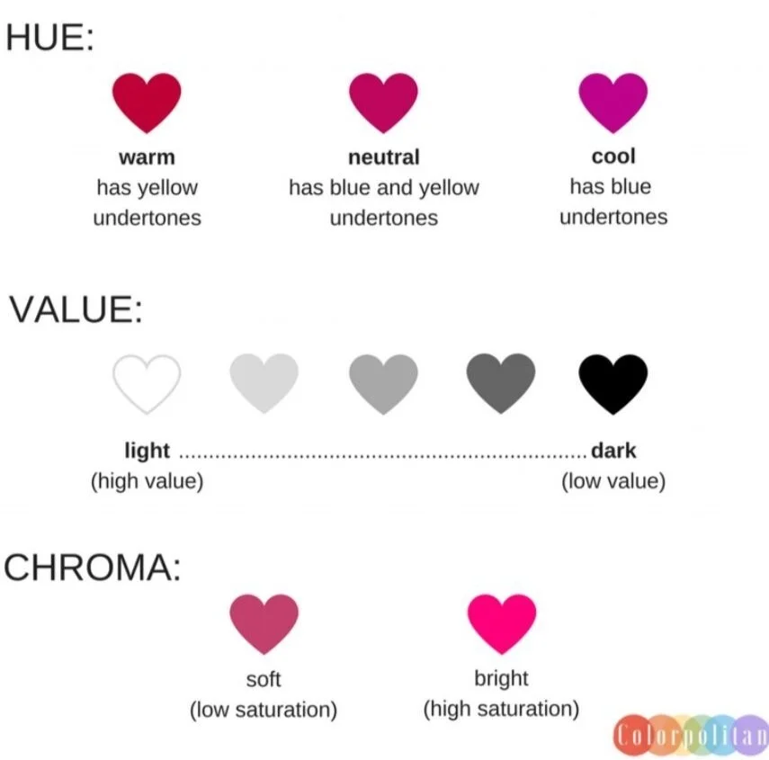 These seasonal tones represent 12 distinct areas of color space and are distinguished from one another based on the three core properties of color; hue, value and chroma.